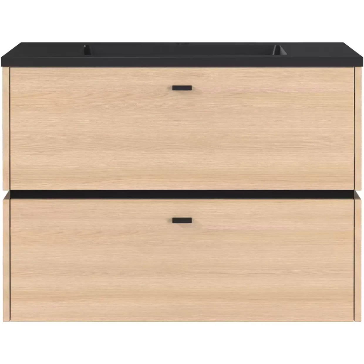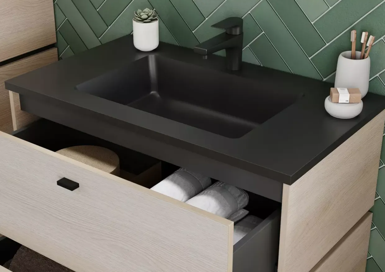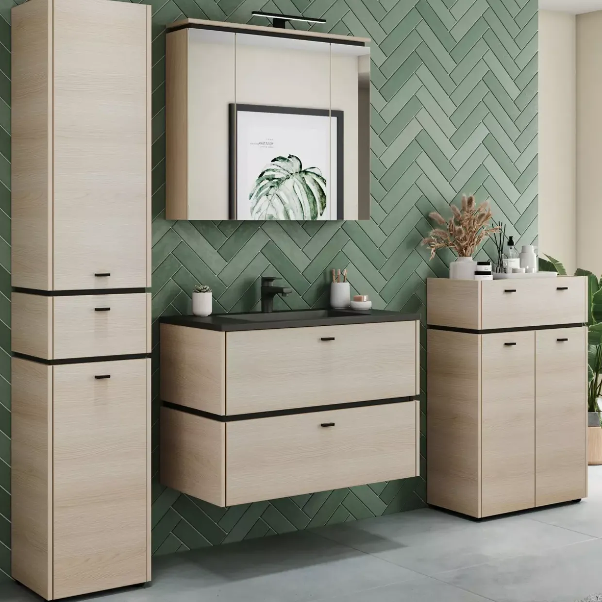 Melaminharzbeschichtete Oberflächen garantieren eine robuste und pflegeleichte Nutzung, ideal für den Alltag. Clever konzipierte Steggriffe verleihen den Möbeln nicht nur eine elegante Note, sondern sorgen auch für eine einfache und komfortable Handhabung. Die integrierten Selbsteinzüge bieten zusätzlichen Komfort und verhindern ein ungewolltes Zuschlagen der Türen.
