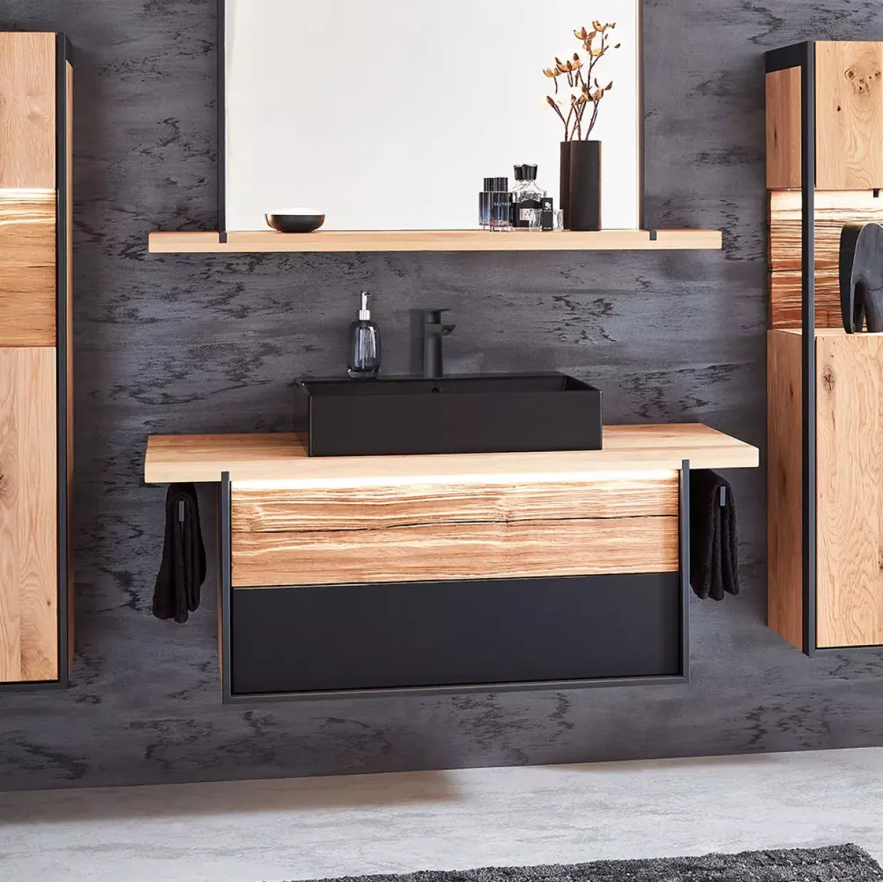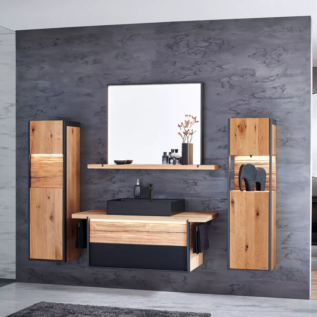 Ein Highlight für Ihr Badezimmer: Der Steel Waschtisch-Kombi, Ausführung Wildeiche, vereint modernes Design und hochwertige Materialien. Die Kombination aus Holz, Glas und Holzwerkstoff verleiht diesem Stück seine unverwechselbare Eleganz. Ein besonderes Augenmerk liegt auf dem harmonischen Zusammenspiel von Wildeiche und der Nachbildung von Colorglas in Graphit. Diese beiden Farbtöne ergänzen sich perfekt und schaffen eine beruhigende Atmosphäre.