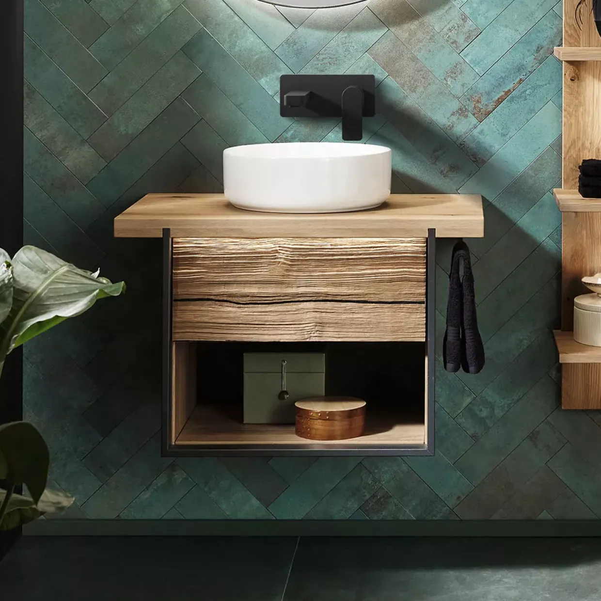 Wildeiche Massiv bringt einen Hauch von natürlicher Eleganz in Ihr Badezimmer. Die Steel Waschtisch-Kombination verbindet modernes Design mit der zeitlosen Schönheit von Holz und schafft so einen harmonischen Blickfang in jedem Raum. Die Kombination aus robustem Material und klaren Linien macht dieses Möbelstück zu einem langlebigen Begleiter im Alltag.