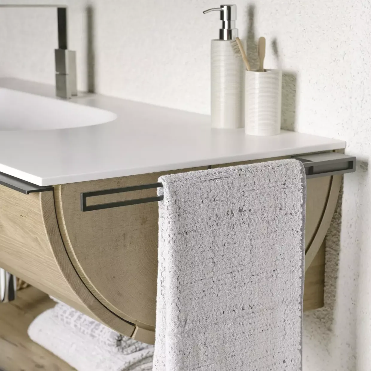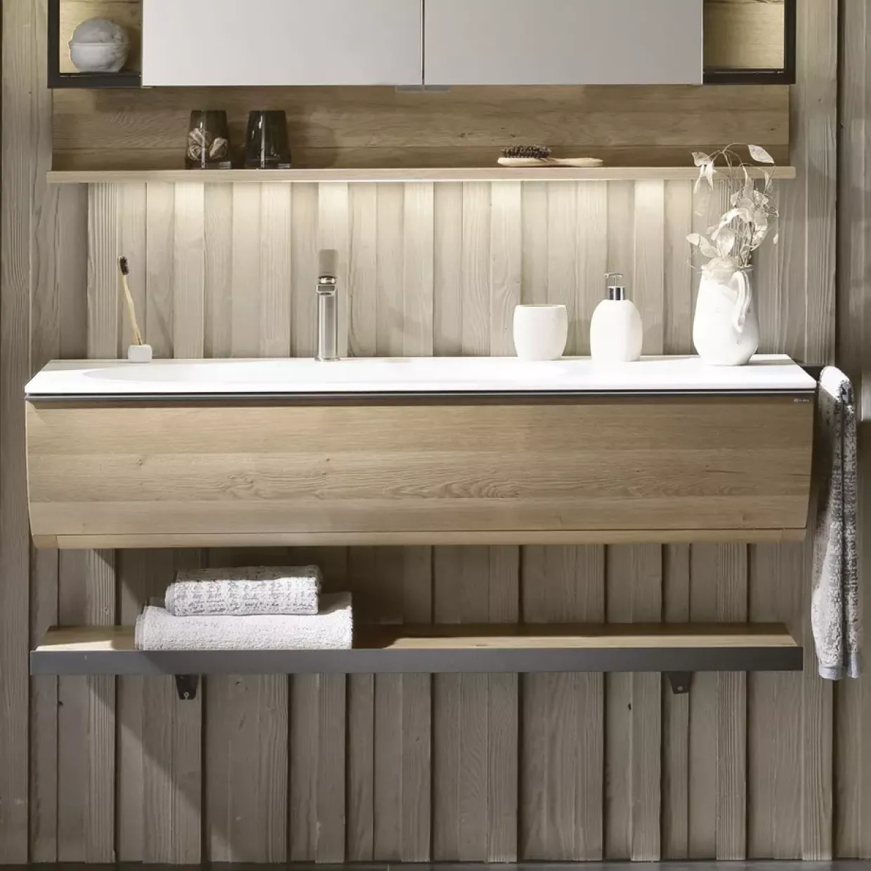 Die furnierte Oberfläche verleiht dem Waschtisch eine edle Optik, die durch das Soft-Close-System abgerundet wird. Dieses sorgt für ein sanftes und geräuschloses Schließen der Schubladen, was den alltäglichen Komfort erhöht.