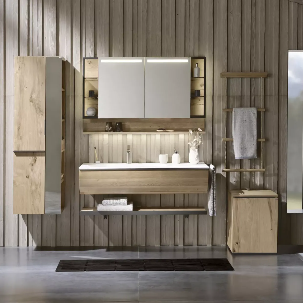 Der moderne Stil des VquellBad Waschtischs vereint Eleganz und Funktionalität in einem einzigartigen Design. Alteiche rustiko lackiert und schwarzgrau harmonieren perfekt und schaffen eine warme, einladende Atmosphäre in Ihrem Badezimmer. Das Zusammenspiel von Holz, Holzwerkstoff und Metall sorgt für eine langlebige und robuste Konstruktion.