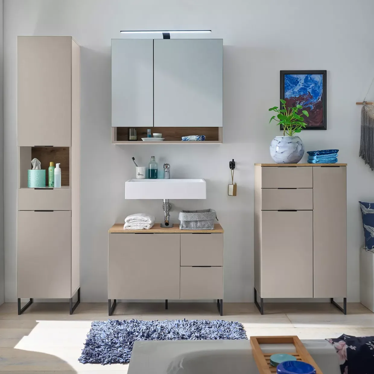 Ein besonderes Highlight ist der Schubkastenauszug mit Unterflurauszug, der durch seine geschickte Konstruktion optimale Raumausnutzung ermöglicht. Der sanfte und leise Schließmechanismus des Soft-Close-Systems erhöht den Komfort und schützt zugleich das Möbelstück. Der Unterschrank ist in einer Auswahl an stilvollen Farben wie Kaschmier, Evoke Eiche und Schwarz erhältlich, die sich nahtlos in verschiedene Einrichtungsstile integrieren lassen.