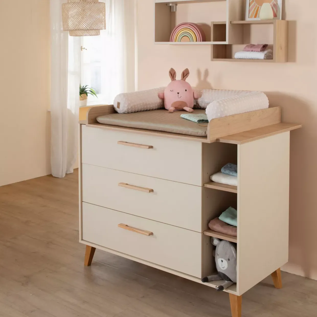 Ein wahres Highlight dieser Wickelkommode ist der flexibel montierbare Wickelansatz, der rechts, mittig oder links angebracht werden kann. Die Kombination aus Cashmere und Virginia Chestnut verleiht dem Möbelstück eine elegante, skandinavische Note. Gefertigt aus Holzwerkstoff und echtem Holz, bietet die Kommode nicht nur Stabilität, sondern auch eine ansprechende Optik.