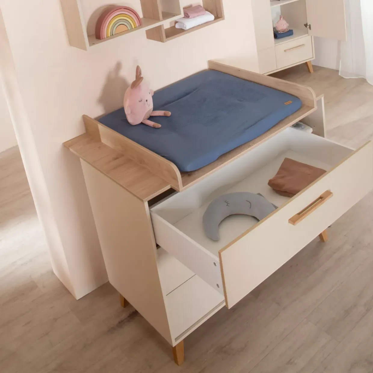 Pflegeleicht und praktisch: Ein einfaches feuchtes Tuch genügt, um die Kommode sauber zu halten. Die durchdachte Konstruktion und die Wahl hochwertiger Materialien machen sie zu einem langlebigen Begleiter im Alltag. Ob als zentraler Blickfang oder dezenter Bestandteil des Raumes – diese Wickelkommode überzeugt durch ihre Vielseitigkeit und ihr durchdachtes Design. Ein Muss für alle, die Wert auf Ästhetik und Funktionalität legen.
