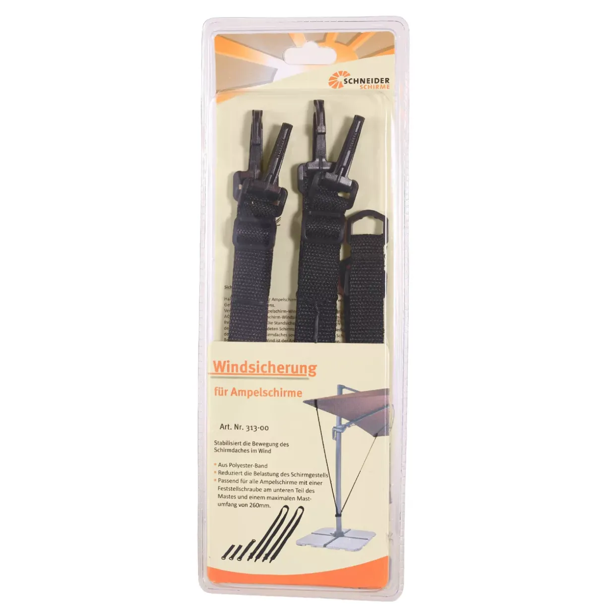 bestehend aus: 1 Windsicherung für Ampelschirme (1xMaß- / 2xStrebenbefestigung 2xAbspannbänder)