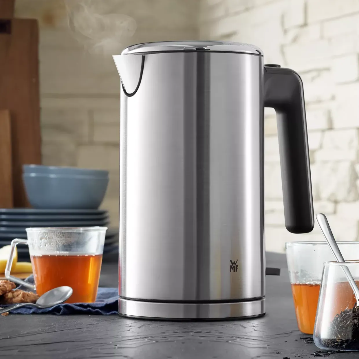 Das doppelwandige Gehäuse aus elegantem Cromargan® verleiht dem Wasserkocher Lono von WMF eine moderne und zugleich edle Ästhetik. Mit einer beeindruckenden Leistung von 2.400 Watt erwärmt er bis zu 1,3 Liter Wasser schnell und effizient. Die innovative Safety Touch-Technologie sorgt dafür, dass das Gehäuse während des Kochvorgangs kühl bleibt und sicher berührt werden kann.