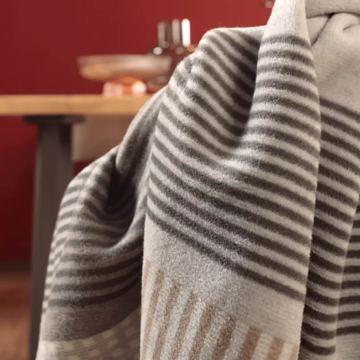 Feine Streifen und filigrane geometrische Muster verschmelzen zu einem lebendigen Karo, das dieser Wohndecke einen modernen Look verleiht. Die dezente Farbpalette aus harmonischen Grautönen, warmem Braun und hellem Ecru fügt sich nahtlos in diverse Einrichtungsstile ein. Ganzjährig einsetzbar, bietet diese Wohn- und Heimdecke nicht nur optische, sondern auch funktionale Vorzüge.Gefertigt aus einer hochwertigen Baumollmischung, sorgt sie mit ihrer weichen und pflegeleichten Oberfläche für ein angenehmes Wohlgefühl. Rechteckig und in einem modernen Stil gehalten, ist sie ein vielseitiger Begleiter, der sowohl auf dem Sofa als auch im Schlafzimmer eine gute Figur macht.Besondere Beachtung verdienen die Pflegehinweise, die den Erhalt der Materialqualität sicherstellen. Maschinenwäsche bei bis zu 30°C im Schonwaschgang wird empfohlen. Auf Bleichmittel und das Bügeln sollte verzichtet werden. Auch der Trockner bleibt besser außen vor, während eine schonende Reinigung mit Perchlorethylen möglich ist.Eine Wohndecke, die durch ihr zeitloses Design und ihre beständige Qualität überzeugt. Einmal erworben, wird sie schnell zum unverzichtbaren Accessoire, das in keinem Haushalt fehlen sollte.