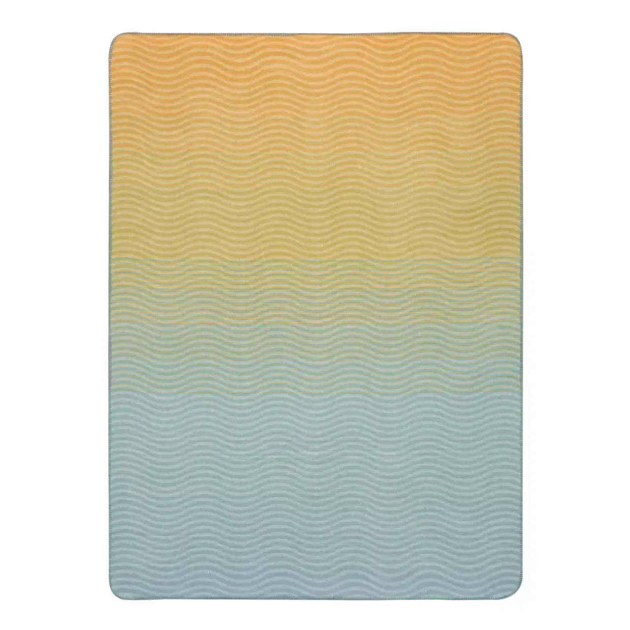 Sommerlich-maritime Akzente bringt diese moderne Wohndecke mit ihrer rechteckigen Form in Ihr Zuhause. Die exquisite Farbgebung in Ocean Nuance zaubert mit einem harmonischen Übergang von zartem Himmelblau zu sonnigem Gelb eine Atmosphäre, die an Meer und Strand erinnert. Mit ihrer fühlbaren Reliefstruktur aus hochwertigem Mischgewebe wird das Wellendessin auf der weichen Oberfläche der Decke erlebbar.