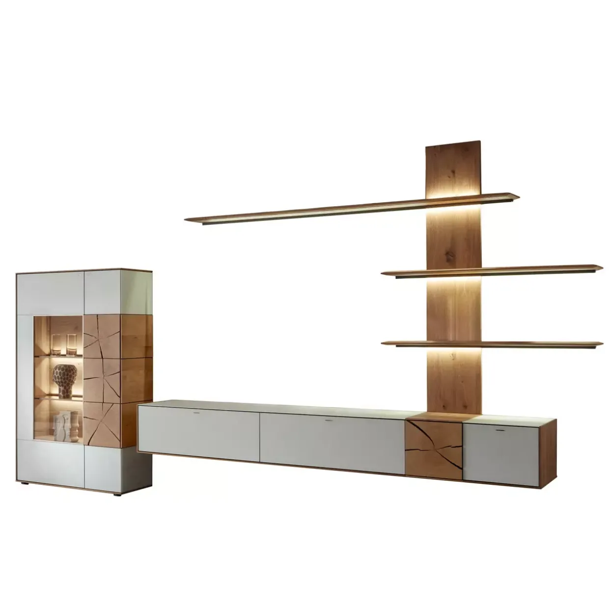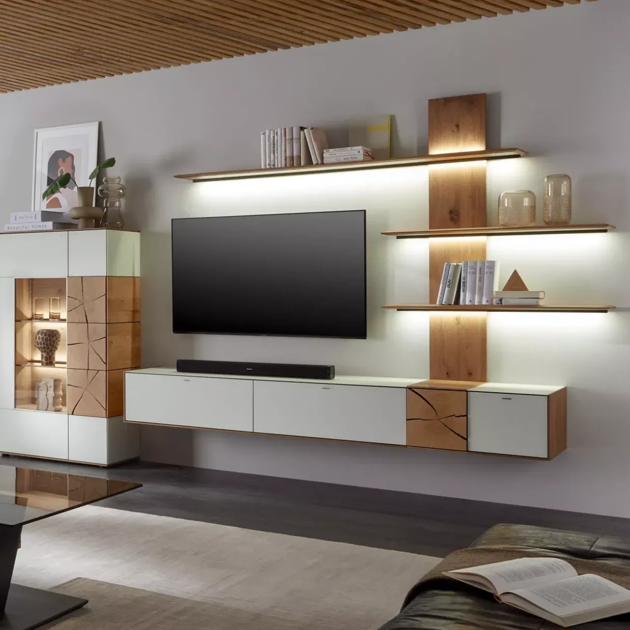 Zusammengefasst vereint diese Wohnwand Funktionalität und stilvolle Ästhetik in einem naturverbundenen Design. Sie fügt sich nahtlos in verschiedene Wohnkonzepte ein und bietet dabei ausreichend Stauraum für persönliche Gegenstände. Diese Möbelstücke sind mehr als nur funktionale Einrichtungsgegenstände – sie sind Ausdruck eines Lebensstils, der Wert auf Qualität und Natürlichkeit legt.