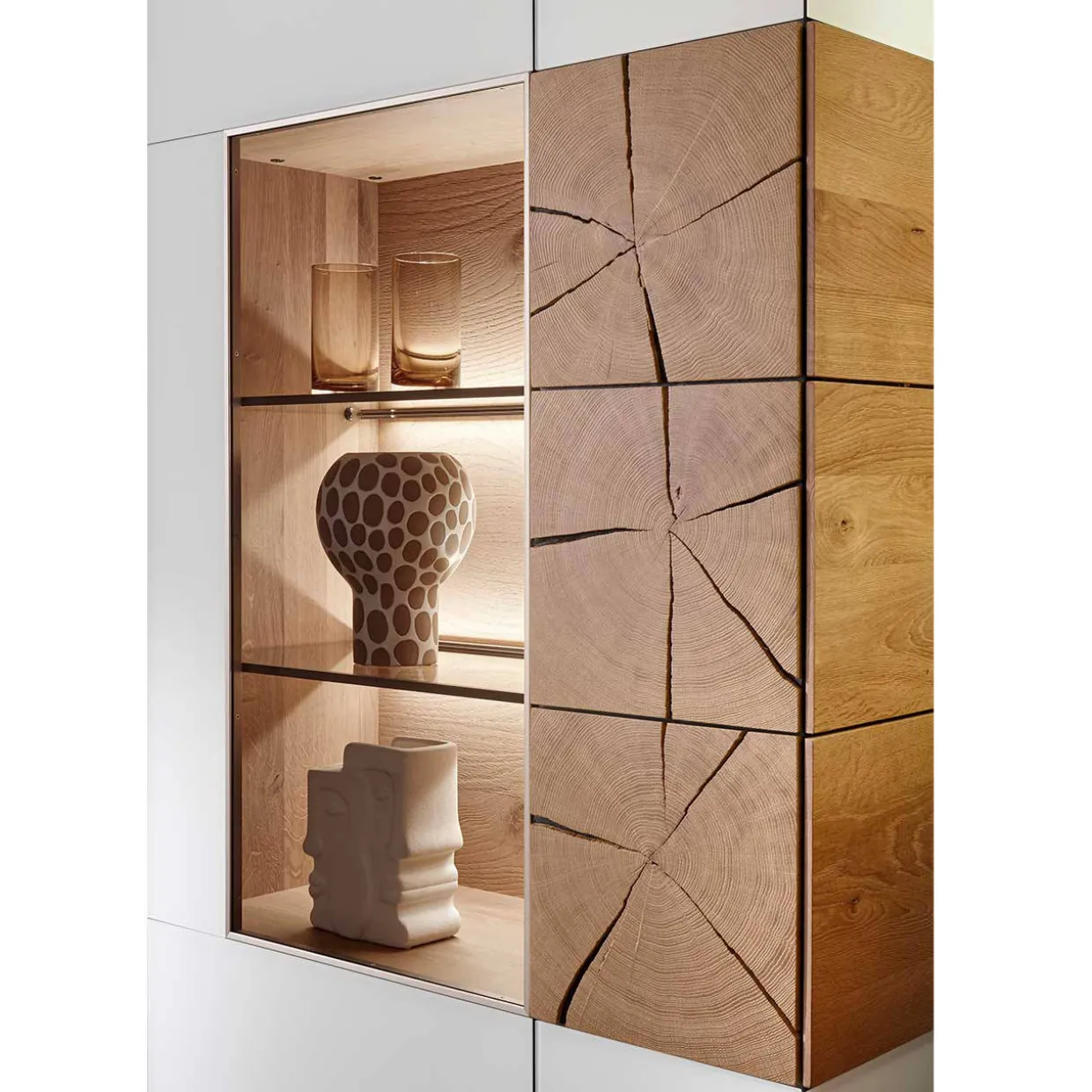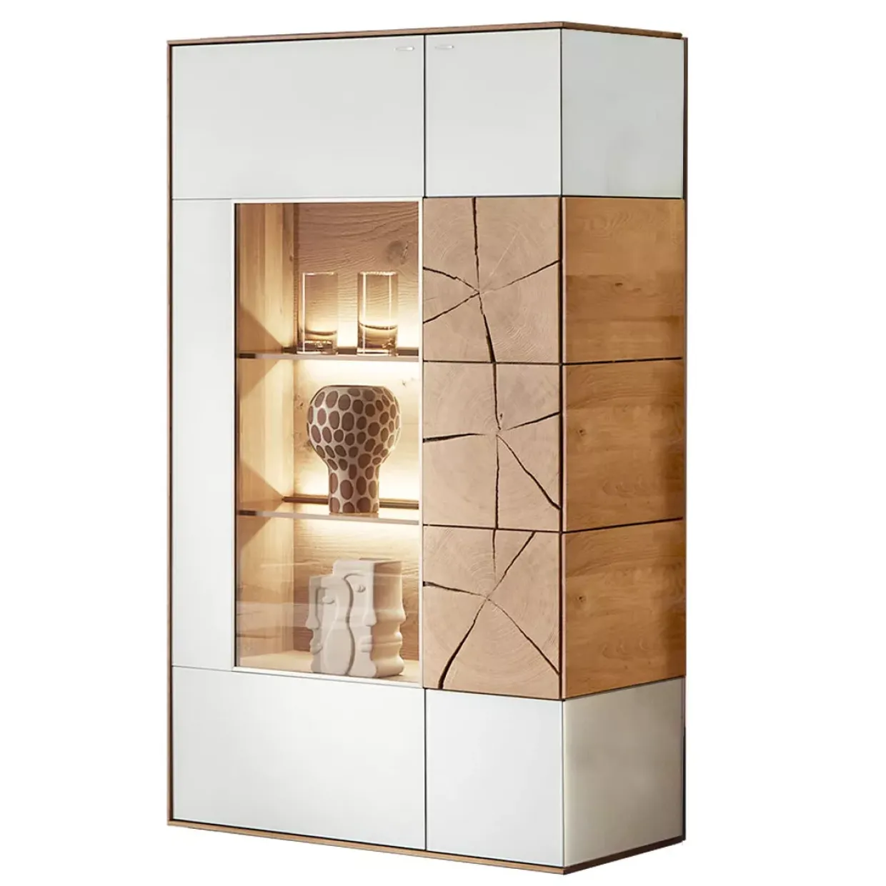 Kerneiche Umato massiv verleiht der Kombi-Wohnwand eine natürliche Eleganz, die in jedem Wohnraum für eine warme Atmosphäre sorgt. Die Kombination aus Eiche und Mattglas in Weiß bildet eine harmonische Verbindung, die das Design auf ein neues Niveau hebt.
