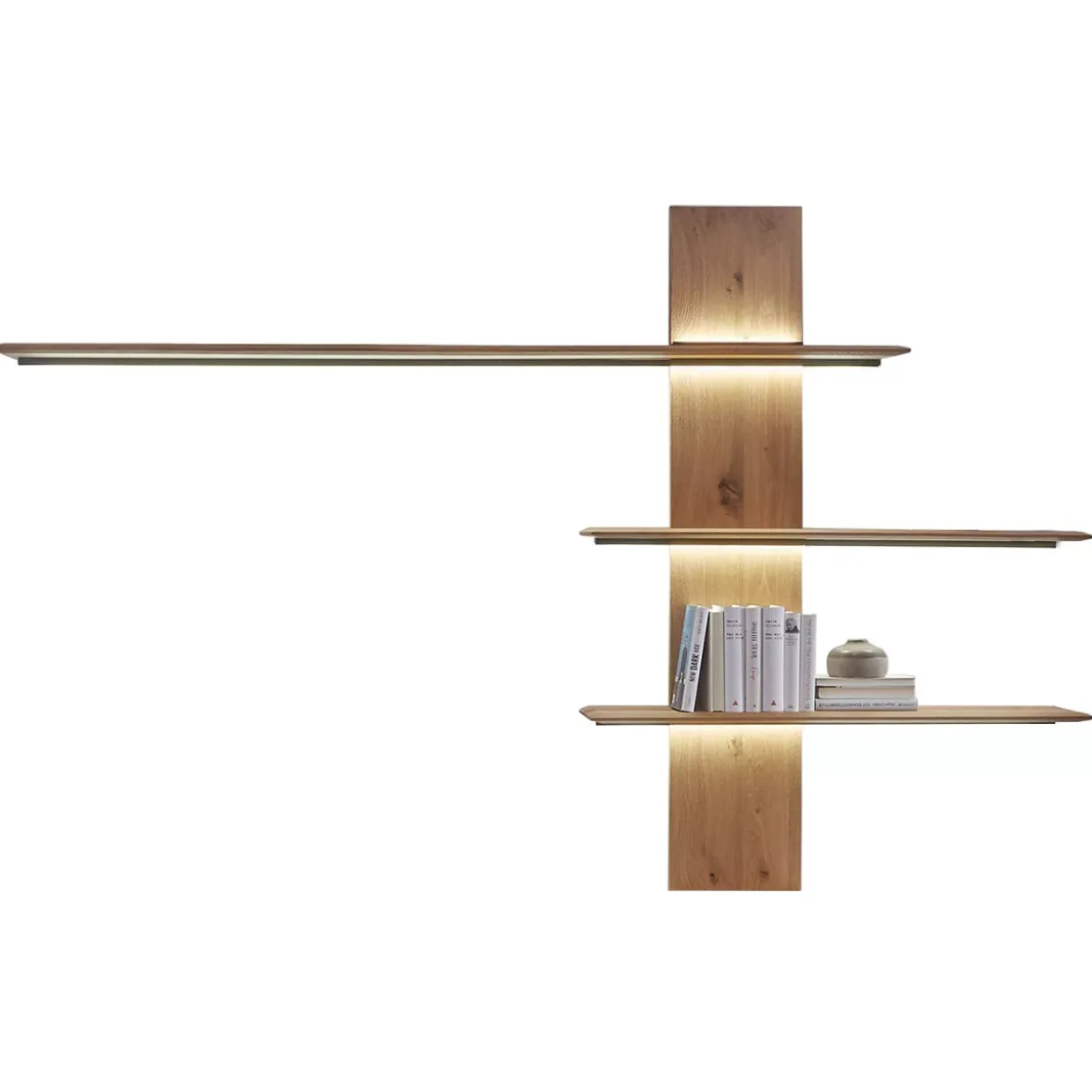Ein Wandpaneel mit drei zusätzlichen Holzböden rundet das Ensemble ab und bietet weitere Gestaltungsmöglichkeiten. Die gebürstete Oberfläche der Eiche unterstreicht die Natürlichkeit des Materials und verleiht den Möbelstücken eine besonders angenehme Haptik.