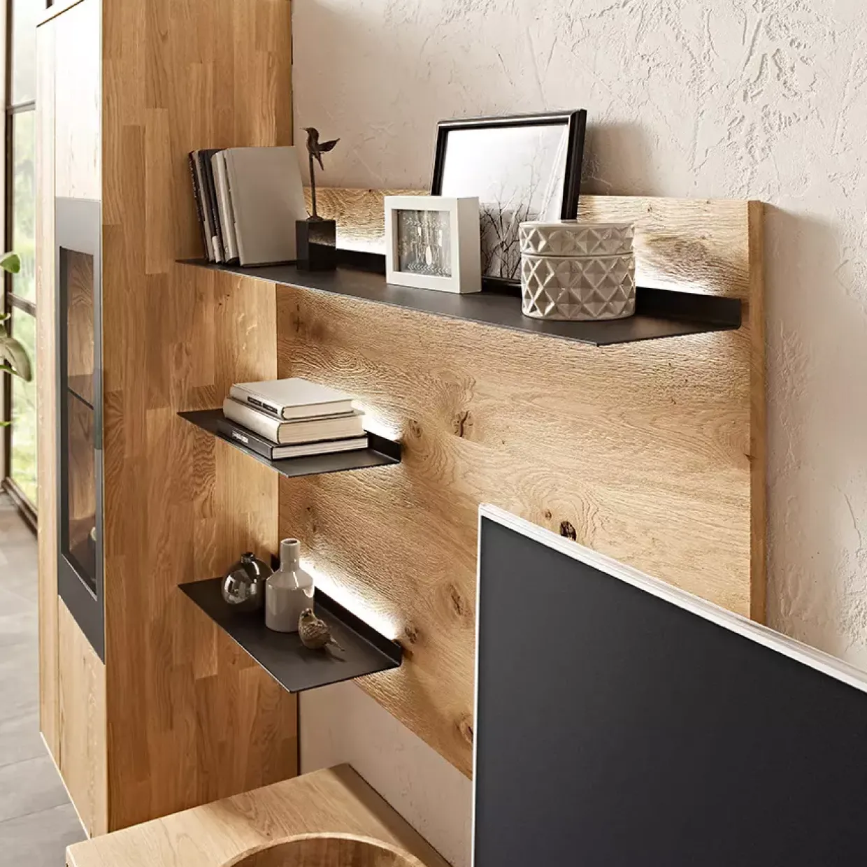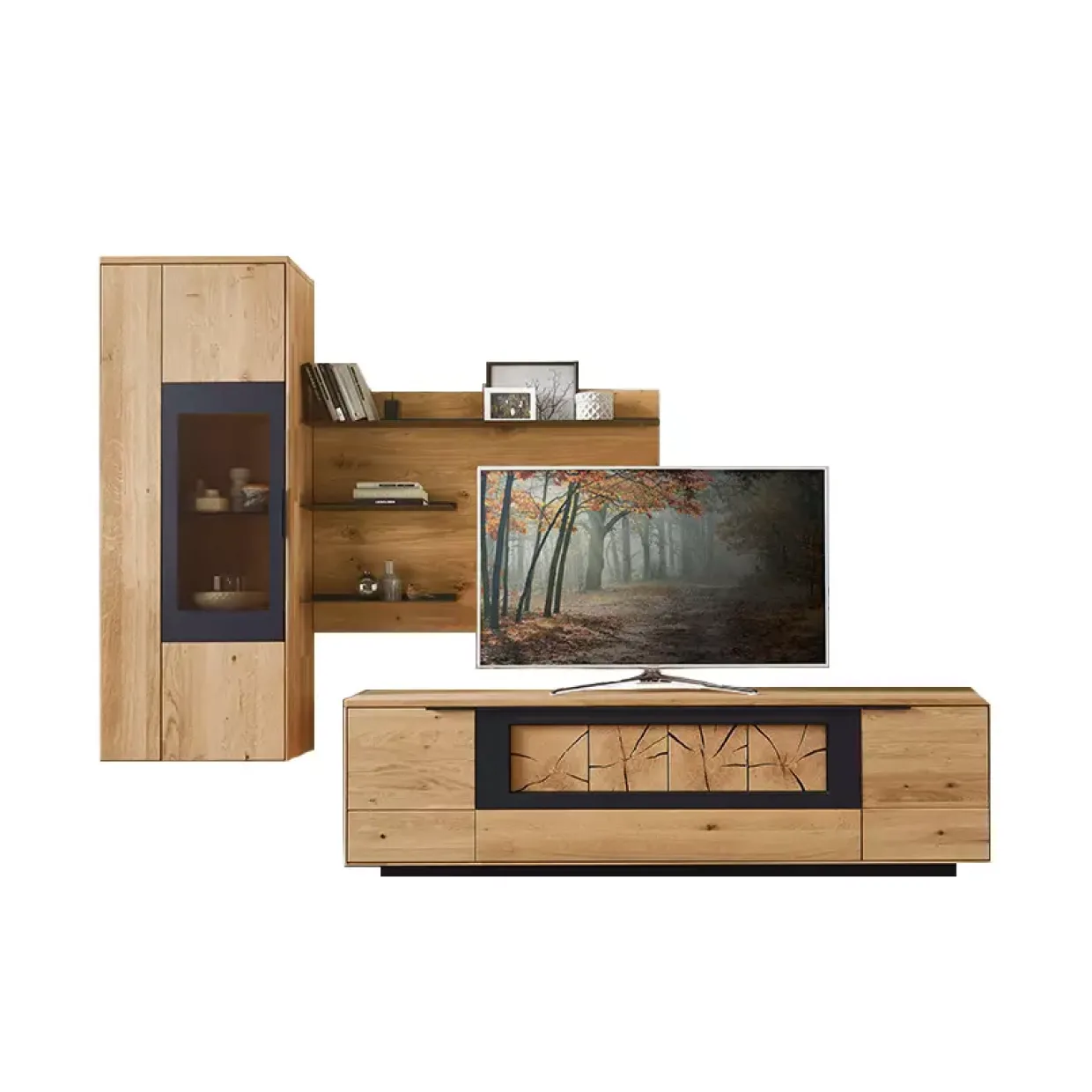 Die Wohnkombination bietet durch die akzentuierte Hirnholz-Scheibe auf einer schwarzen Holzwerkstoffplatte eine besondere Note. Holzwerkstoffe, die carbonfarbig strukturlackiert sind, runden das Gesamtbild ab und machen das Möbelstück zu einem Highlight in jedem Wohnraum.