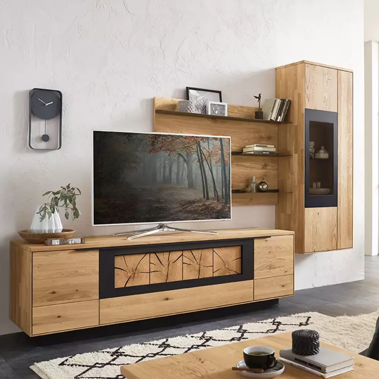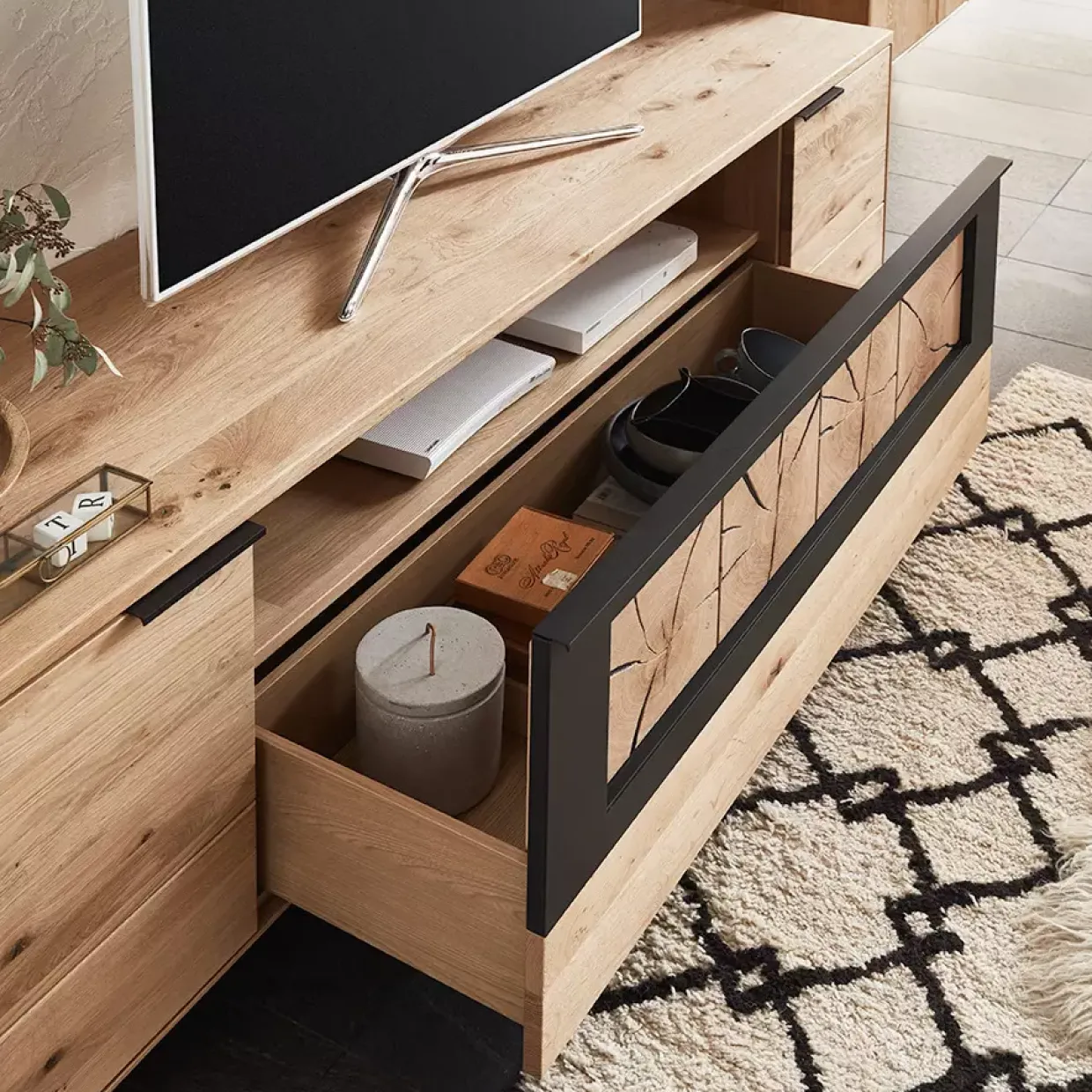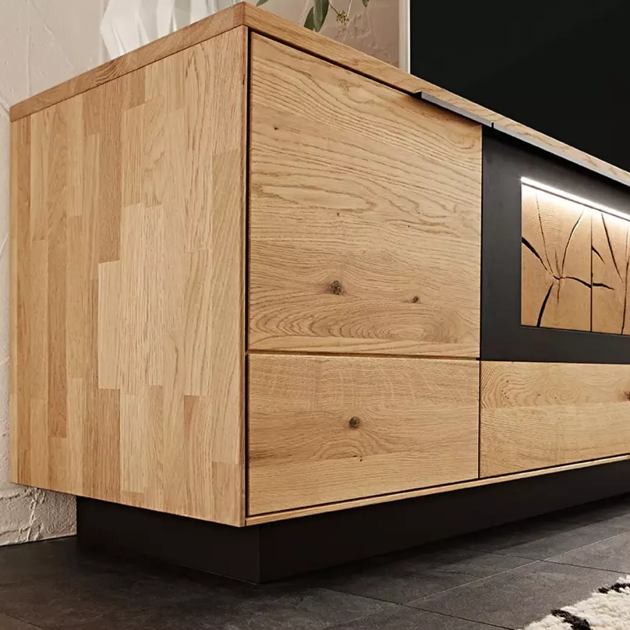 Massive, soft gebürstete Wildeiche verleiht der Wohnkombination Cortona eine zeitlose Eleganz, die sich harmonisch in moderne Wohnräume einfügt. Drei Drehtüren bieten großzügigen Stauraum und bestechen durch ihre gedämpfte und langlebige Beschlagstechnologie, die einen leisen und sanften Schließvorgang garantiert. Die Kombination aus Holz und metallischen Akzenten, wie den carbonfarbig strukturgepulverten Metallteilen, sorgt für eine stilvolle und robuste Struktur.