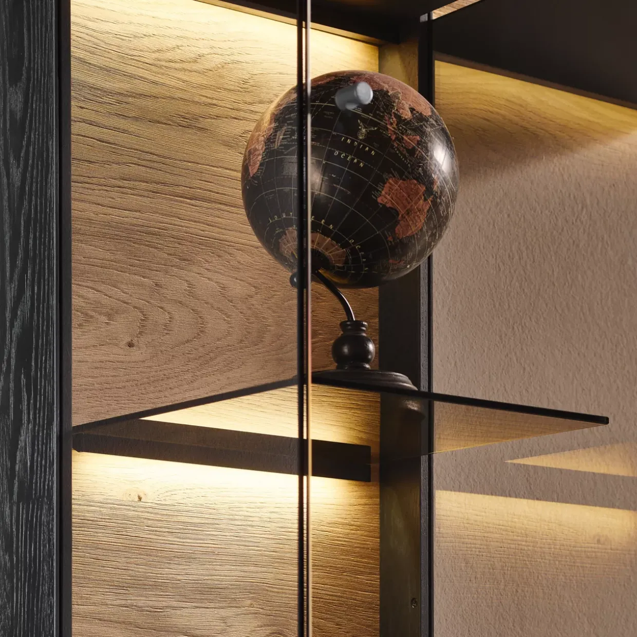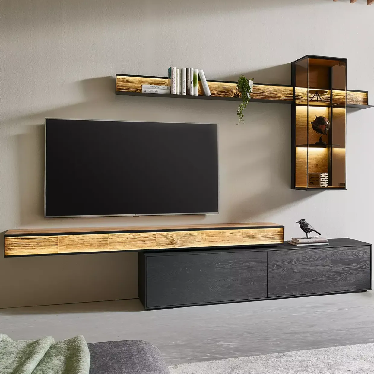 Betonen Sie Ihre Wohnlandschaft mit der Hängevitrine, die durch einen Glas- und einen Metallboden sowie eine weitere Spaltholzapplikation hervorsticht. Jedes Element dieser Wohnkombination ist darauf ausgelegt, Ihrem Raum Struktur und Design zu verleihen.
