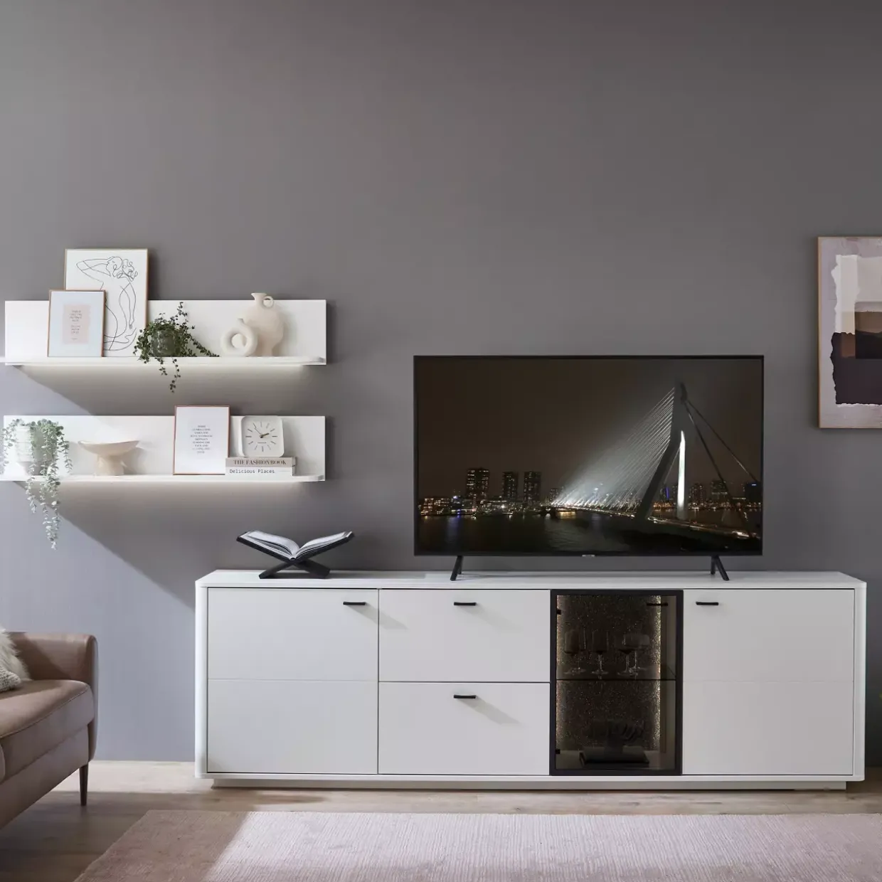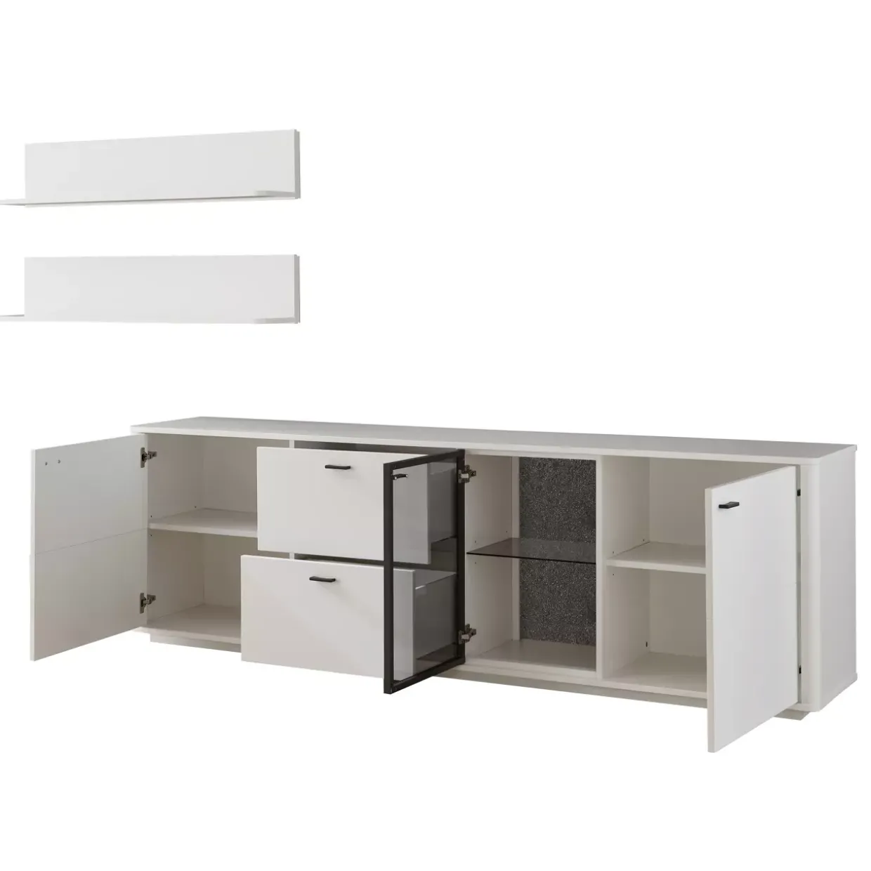 Die Kombination aus Glas, Holzwerkstoff und Metall bietet eine harmonische Verbindung von Materialien, die jedem Raum ein elegantes Ambiente verleiht. Die Wohnkombination Montreal, gestaltet in einem stilvollen Mix aus weißen Oberflächen und Kristallstein-Akzenten, passt sich nahtlos in verschiedenste Einrichtungsstile ein. Besondere Aufmerksamkeit verdient das Unterteil, das mit zwei Holztüren, einer Glastür und zwei Schubkästen ausgestattet ist. Diese Elemente bieten ausreichend Stauraum für eine Vielzahl von Gegenständen und schaffen gleichzeitig Ordnung und Übersichtlichkeit. Zwei Holzeinlegeböden und ein Glaseinlegeboden ermöglichen eine flexible Anpassung des Stauraums an individuelle Bedürfnisse, sodass Sie Ihre persönlichen Schätze und Dekorationsobjekte stilvoll präsentieren können. Ein weiterer Pluspunkt ist das Parsolglas, das durch seine dezente Transparenz eine moderne Note setzt, ohne aufdringlich zu wirken. Die Wohnkombination ist nicht nur funktional, sondern auch ein optisches Highlight, das durch seine klaren Linien und das durchdachte Design überzeugt. Ideal für alle, die auf der Suche nach einem Möbelstück sind, das sowohl praktischen Nutzen als auch ästhetischen Anspruch vereint. So wird jeder Wohnraum zu einem Ort, an dem man sich gerne aufhält.