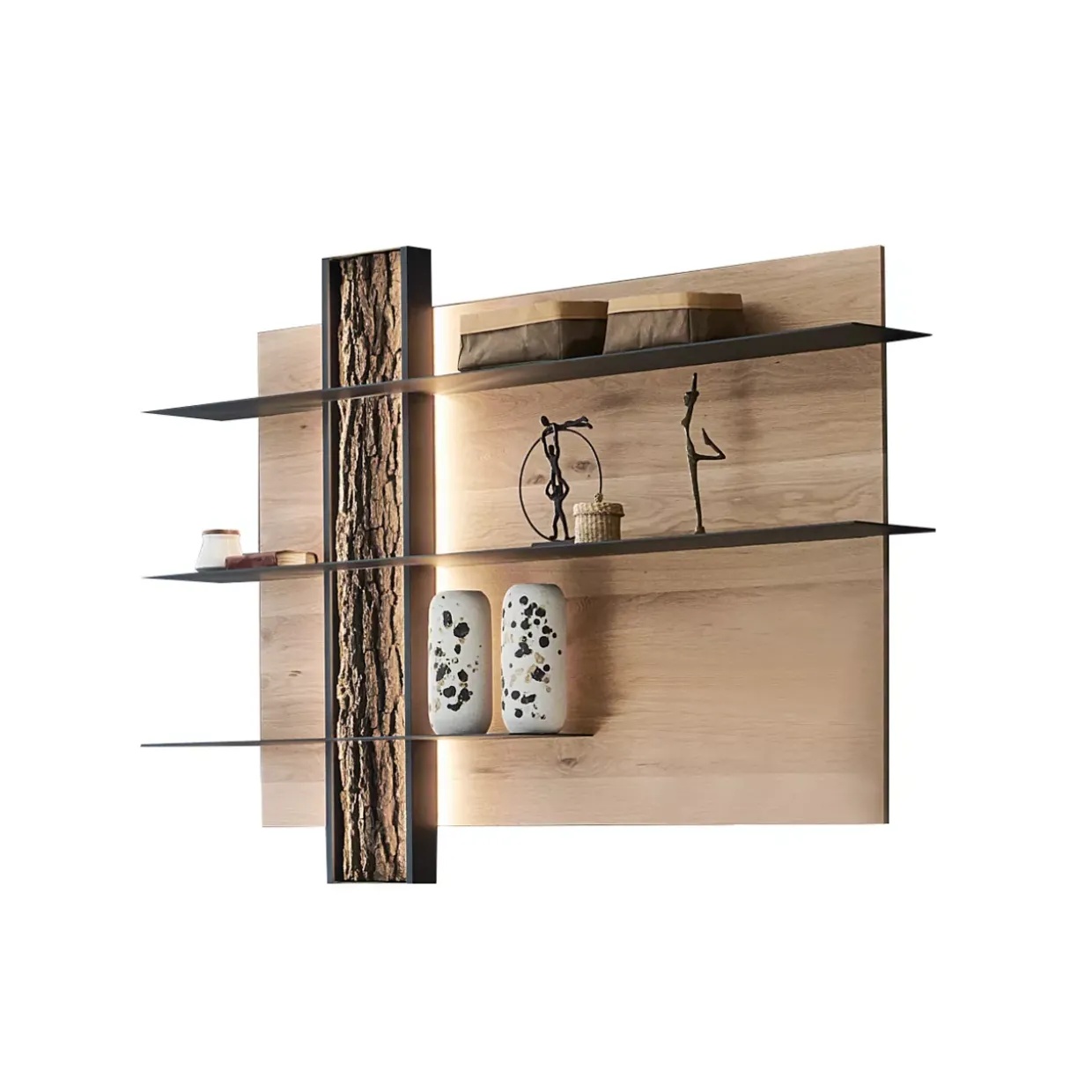 Kerneiche massiv gebürstet und die Applikation echter Rinde verleihen dieser Wohnwand eine unverwechselbare Natürlichkeit. Die Kombination aus Holz und Metall zeigt eine harmonische Verbindung von Materialien, die sowohl Robustheit als auch Eleganz ausstrahlen. Das Modell Runa bietet mit seinen Drehtüren eine praktische Lösung für den täglichen Gebrauch.