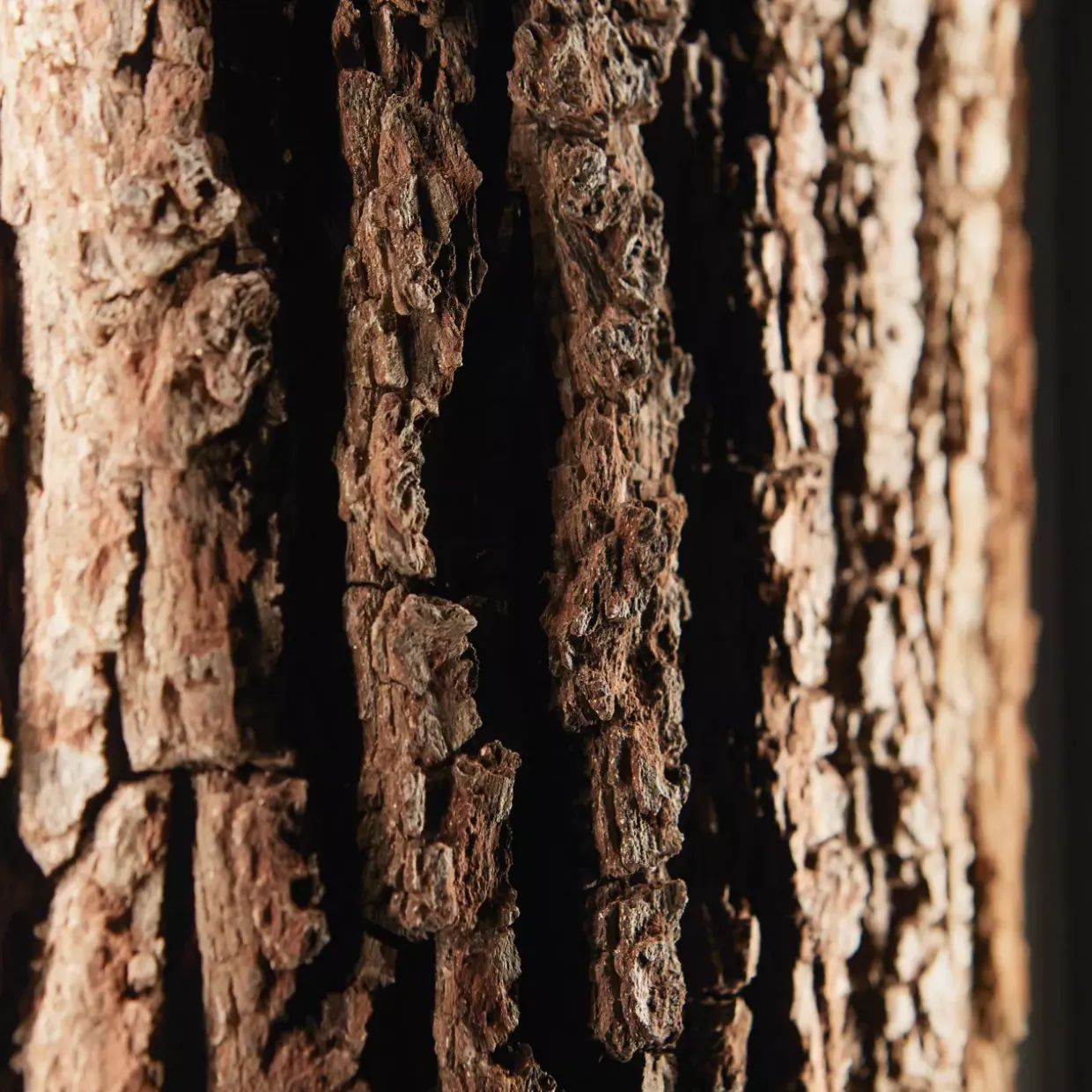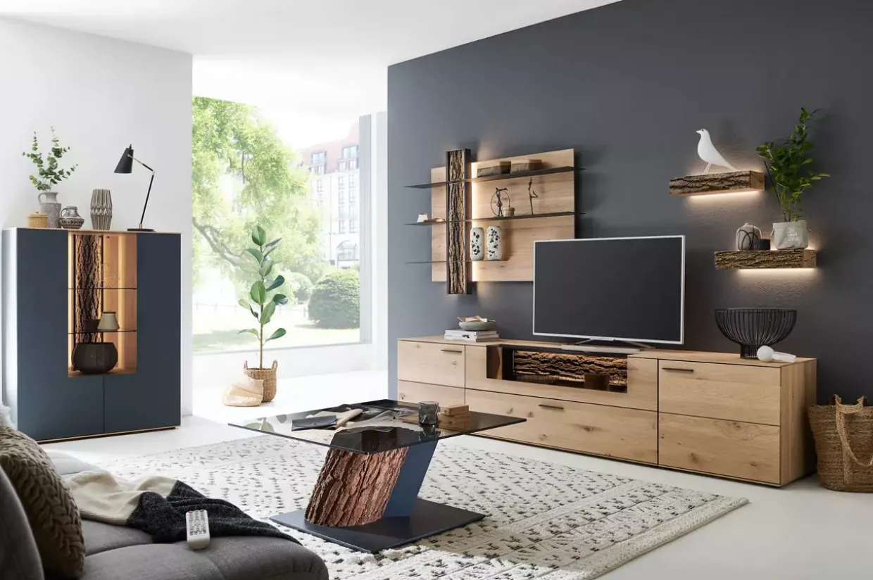 Ein besonderes Highlight ist die Verwendung von echter Baumrinde, die vom ganzen Stamm abgesägt wird. So wird ein kompletter Teil des Baumes in das Design integriert, was jedem Möbelstück eine einzigartige Geschichte verleiht. Die moderne Gestaltung in anthrazit harmoniert perfekt mit der natürlichen Optik der Eiche und passt sich mühelos in ein zeitgemäßes Wohnambiente ein.