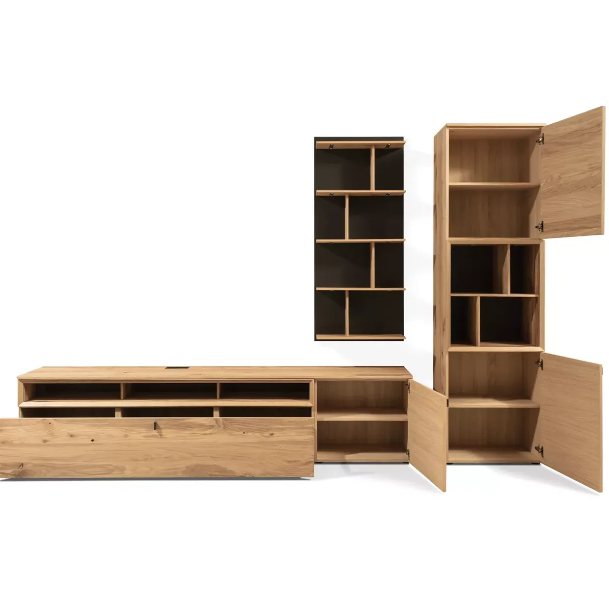 Die natürliche Maserung des Holzes, gepaart mit der matten Lackierung, strahlt Ruhe und Beständigkeit aus. Diese Wohnwand ist nicht nur ein Möbelstück, sondern ein Statement, das Ihre Wohnräume aufwertet und ein Gefühl von Harmonie und Komfort vermittelt.