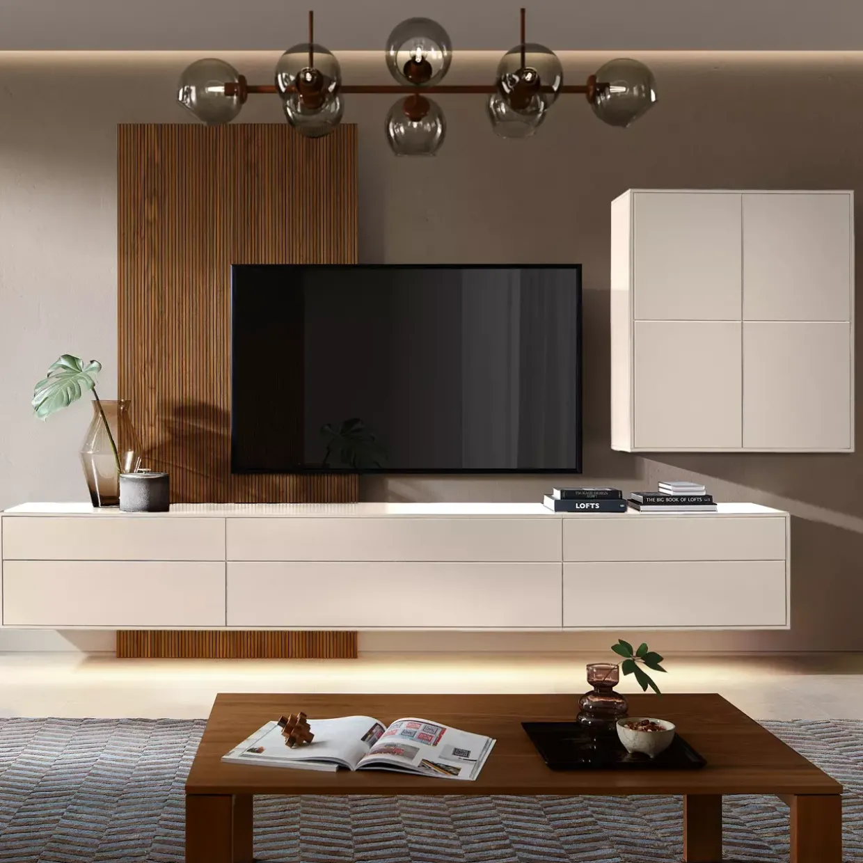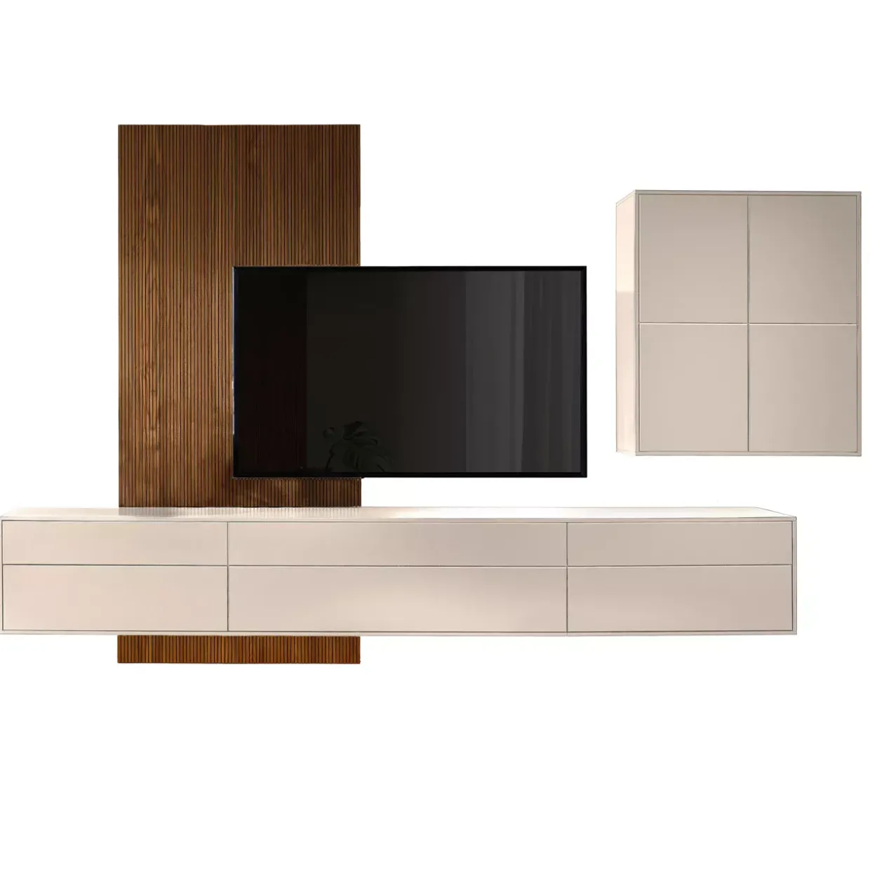Die Verwendung von Holzwerkstoff und echtem Holz garantiert eine langlebige Qualität und Stabilität. Diese Wohnwand verbindet modernes Design mit den Vorzügen traditioneller Handwerkskunst. Sie fügt sich nahtlos in verschiedenste Einrichtungsstile ein und wird so zum Highlight in Ihrem Zuhause.