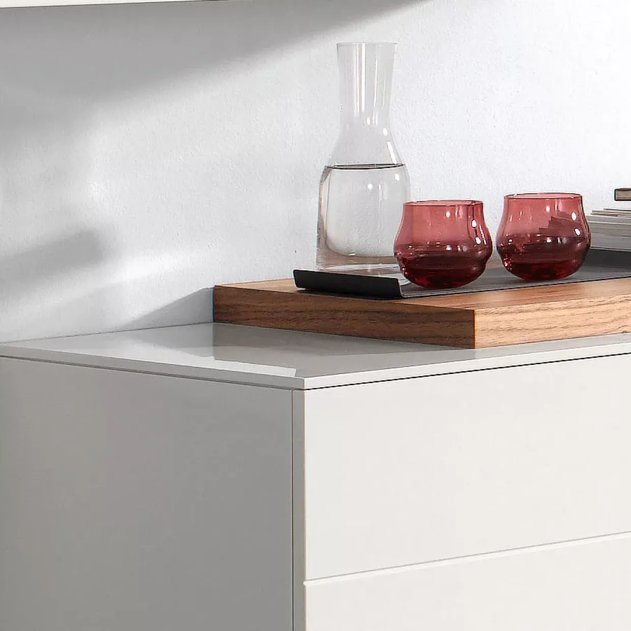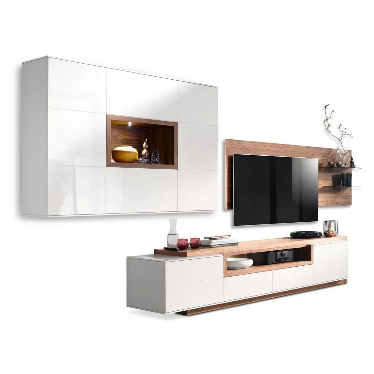 Furnierte Oberflächen bringen den natürlichen Charme des Holzes zur Geltung, während sie gleichzeitig eine langlebige und pflegeleichte Wahl darstellen. Die klare Linienführung und das minimalistische Design machen die Wohnwand zu einem vielseitig einsetzbaren Möbelstück, das sich nahtlos in verschiedene Einrichtungsstile integrieren lässt.