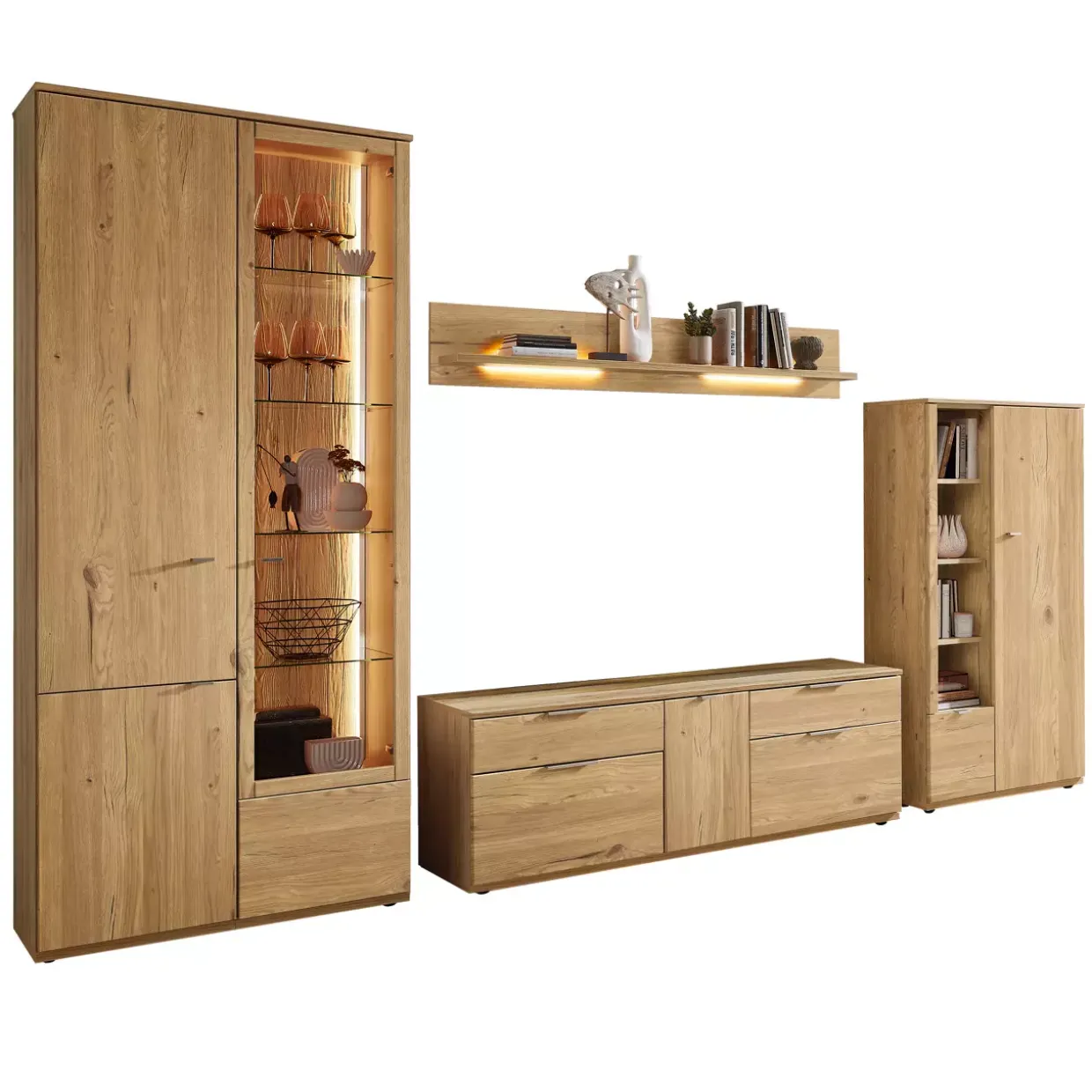 Die warme Ausstrahlung einer Risseiche Nachbildung verleiht der Wohnwand Sellin eine einladende Atmosphäre. Diese klassische Schönheit kombiniert hochwertige Materialien wie Holzwerkstoff, Glas und Metall, zu einem harmonischen Gesamtbild. Die sanft melaminharzbeschichtete Oberfläche sorgt nicht nur für eine ansprechende Optik, sondern auch für eine pflegeleichte Handhabung im Alltag.Eleganz trifft auf Funktionalität mit der praktischen Fußform der Gleiter, die eine leichte Verschiebung und Flexibilität in der Raumgestaltung ermöglicht. Ein besonderes Highlight ist der obere Abschluss mit Abdeckblatt, der den stilvollen Charakter der Wohnwand unterstreicht. Für eine individuelle Note können Sie auf Anfrage eine passende Rückwandschroppung und LED-Beleuchtung integrieren, die das Ambiente zusätzlich veredeln. Ob im Wohnzimmer oder im Büro, die Wohnwand fügt sich nahtlos in verschiedene Raumkonzepte ein und bietet dabei nicht nur Stauraum, sondern auch eine attraktive Präsentationsfläche für Ihre Lieblingsstücke.Mit dieser konventionellen Wohnwand entscheiden Sie sich für ein Möbelstück, das klassische Ästhetik und moderne Funktionalität vereint. Entdecken Sie eine Welt voller Möglichkeiten und gestalten Sie Ihren Wohnraum nach Ihren Vorstellungen.