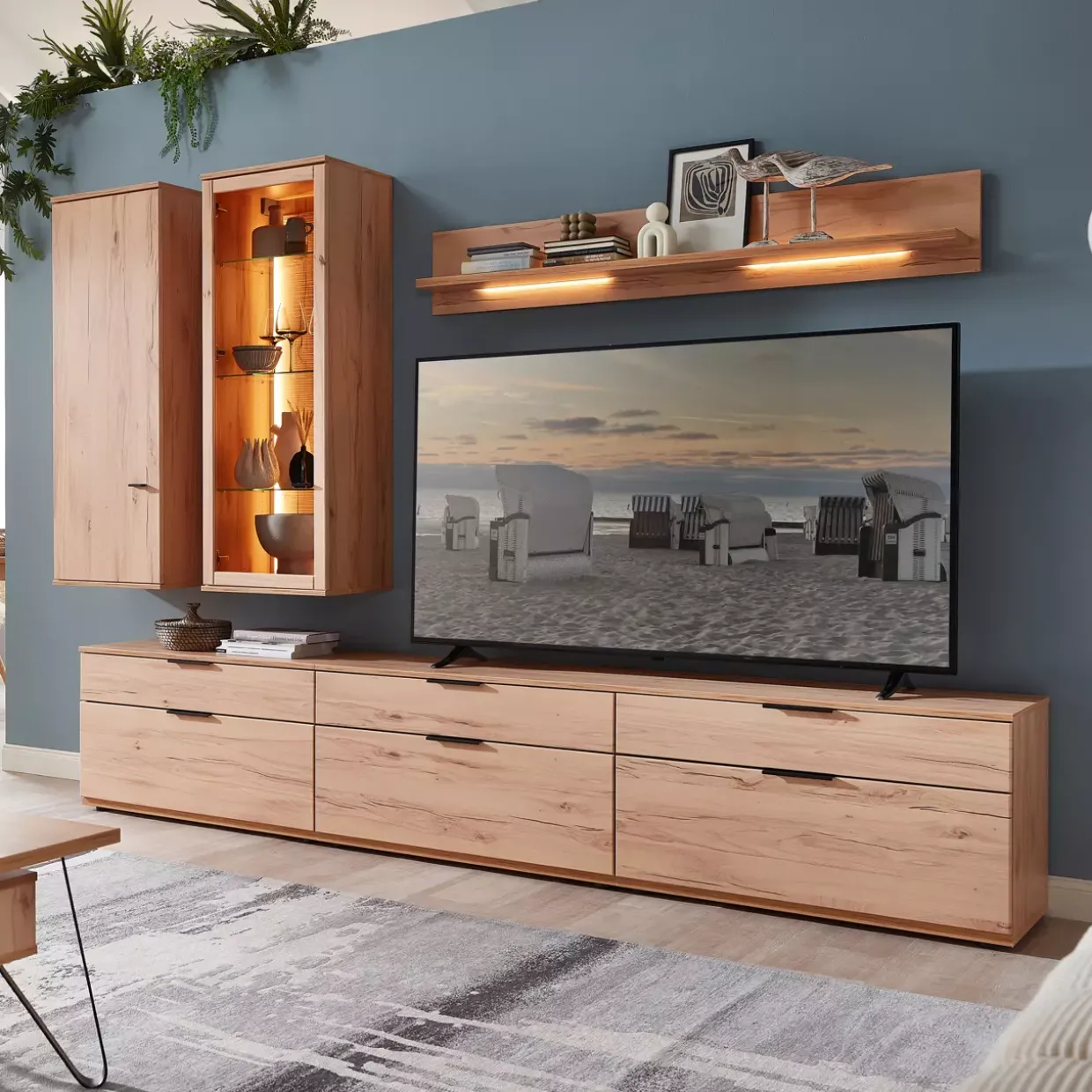 Holzwerkstoff als Hauptmaterial verleiht der Wohnwand nicht nur Stabilität, sondern auch eine warme Ausstrahlung. Diese Kombination sorgt für eine angenehme Atmosphäre, die Behaglichkeit und Stil vereint. Besonders in Räumen, wo Ruhe und Entspannung im Vordergrund stehen, kommt die Wohnwand zur Geltung.