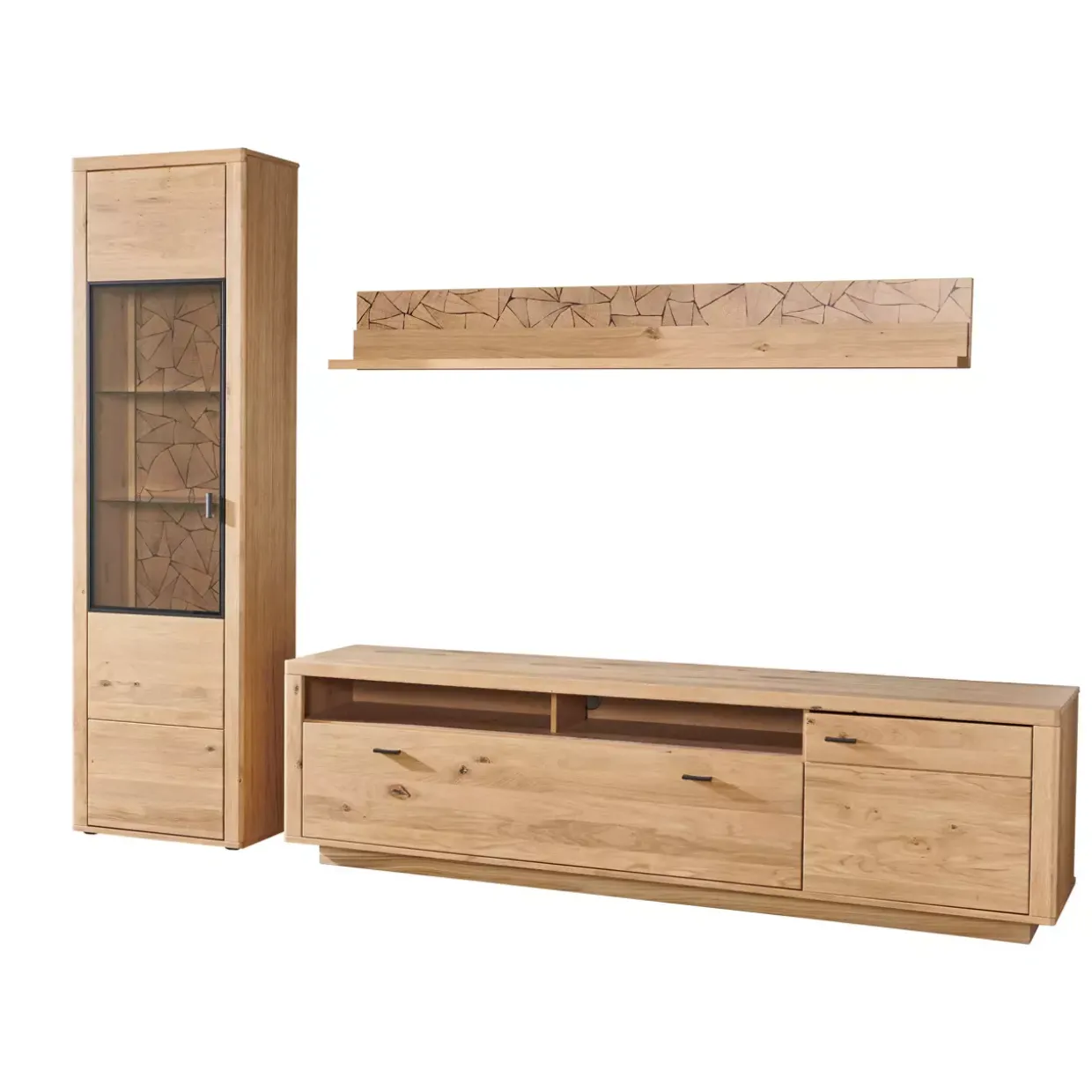 Im Zentrum der Wohnkombination Vamos 16 steht die elegante Drehtür, die sich harmonisch in das Gesamtbild einfügt. Mit einem Stil, der an den charmanten Cottage-Look erinnert, bietet diese Kombination eine warme und einladende Atmosphäre. Die Oberflächen sind in Asteiche furniert, was eine natürliche und zeitlose Optik gewährleistet.